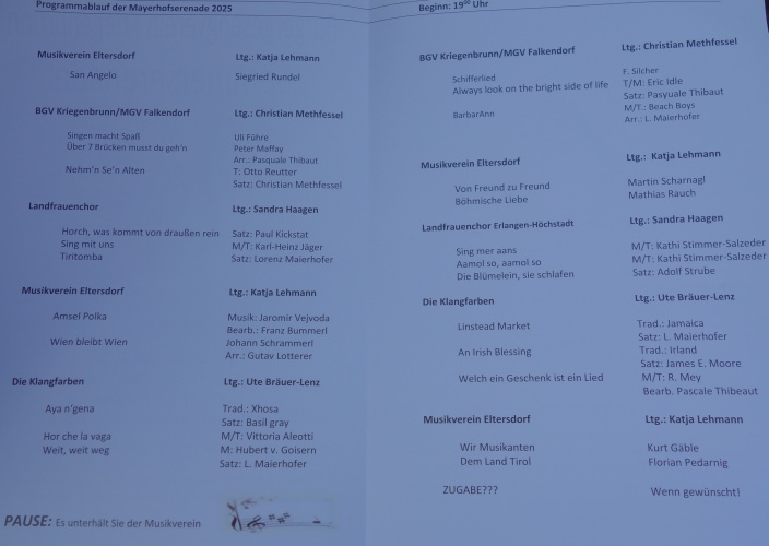 Die Chorgemeinschaft BGV Kriegenbrunn & MGV Falkendorf richtet das Musiker- und Chöretreffen "Mayerhofserenade" in eben dem Mayerhof in Kriegenbrunn bei Erlangen mit viel Liebe und großem Arbeitseinzatz vortrefflich aus. Die Klangfarben waren am 18.07.2025 zum zweiten Mal dabei.